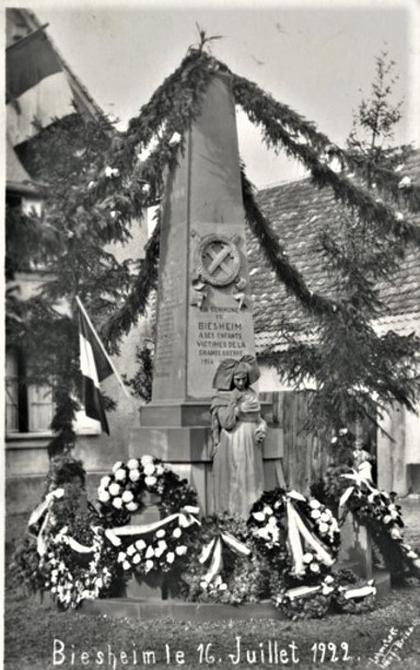 Dès la fin de la guerre de 1914/18, la France encourage par des subventions, l’érection de monuments aux morts dans toutes les communes d’Alsace. Ceux-ci sont uniquement destinés à honorer les combattants français par des cérémonies patriotiques. Le Président de la Raymond Poincaré dans son discours du 9 décembre 1918 à Straßburg est très clair :